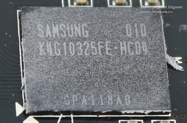 Чипы памяти произведены компанией Samsung. Маркировка чипов — K4G10325FE-HC04, номинальная частота составляет 5 ГГц (эффективная частота). Несмотря на столь высокую номинальную частоту, память GeForce GTX 560 Ti функционирует на более низкой — 4 ГГц.