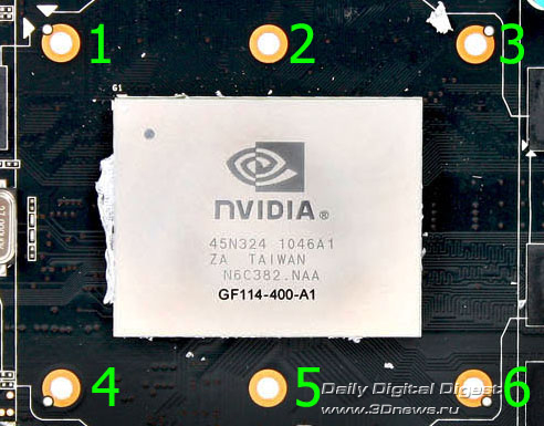 В некоторых случаях, при модернизации видеосистемы пользователи оставляют приобретённые отдельно кулеры, чтобы потом установить их на новую видеокарту. Если вы так и собираетесь сделать, то наверняка информация о расстоянии между монтажными отверстиями вокруг GPU окажется для вас полезной. Для удобства мы пронумеровали отверстия вокруг GPU GF114.