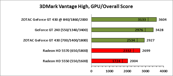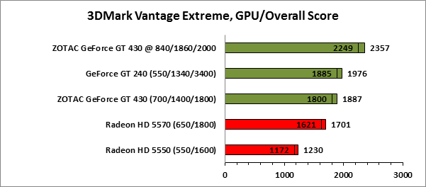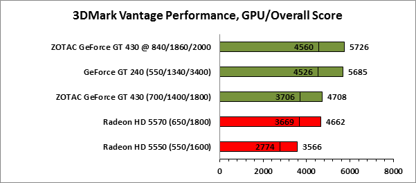 По результатам тестирования в 3DMark Vantage, ускоритель ZOTAC GeForce GT 430 оказался производительней, чем равноценный продукт конкурента – Radeon HD 5570, однако, как и следовало ожидать, в этом тесте новинка на чипе GF108 проиграла своему предшественнику GeForce GT 240 за счёт меньшего количества функциональных блоков.