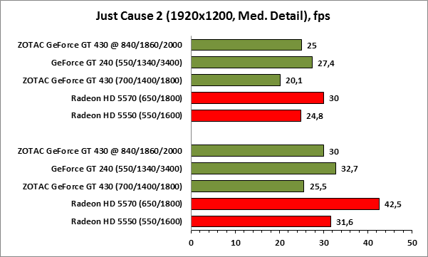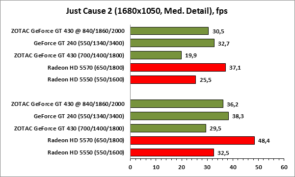 В Just Cause 2 Radeon HD 5550 и 5570 оказываются вне конкуренции, впрочем, этого следовало ожидать, учитывая тёплое отношение движка игры к продуктам AMD. Положение GeForce GT 430 относительно GeForce GT 240 предугадать не трудно, в данном случае даже разгон не помог ZOTAC GeForce GT 430 вырваться вперёд.