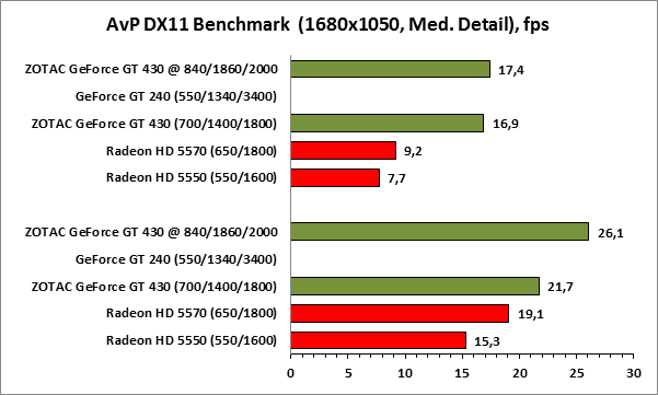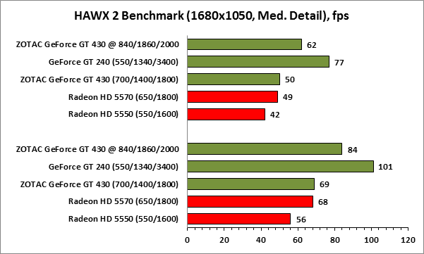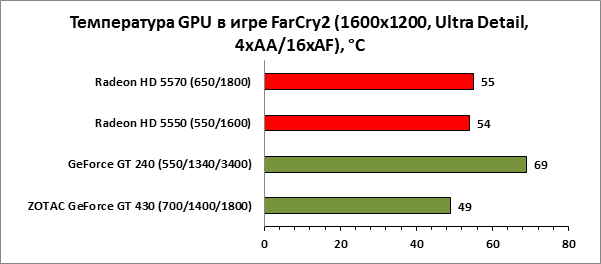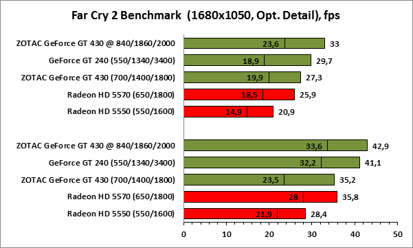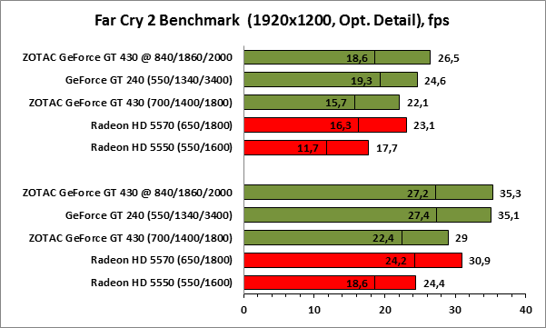 В игре Far Cry 2 ускоритель ZOTAC GeForce GT 430 показывает примерно равные результаты с AMD Radeon HD 5570, где-то опережая, а где-то отставая от него. Работая на номинальных частотах, GeForce GT 430 от ZOTAC не смог справиться со своим предком GT 240, однако после разгона детище ZOTAC сравнялось, а кое-где и опередило “предка”.