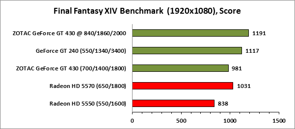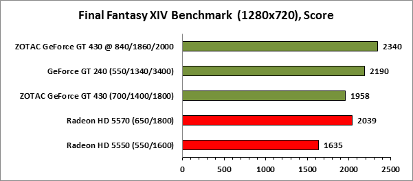 В FF XIV Benchmark видеокарта ZOTAC GeForce GT 430 оказывается немного слабее Radeon HD 5570, что, впрочем, не столь важно, поскольку разница в результатах невелика. Ускоритель GeForce GT 240 в лидерах, но только до тех пор, пока GeForce GT 430 работает на номинальных частотах, после разгона новинка на базе GF108 вырывается в лидеры.