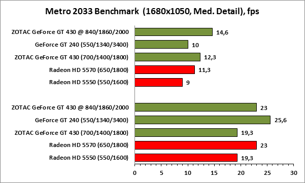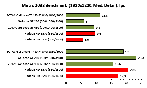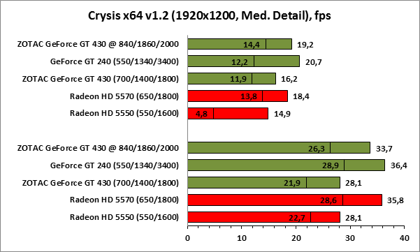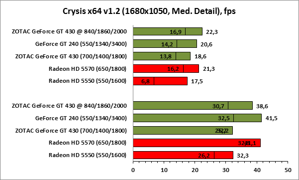 ZOTAC GeForce GT 430 в Crysis может бороться на равных только с Radeon HD 5550, отставая при этом от Radeon HD 5570 и GeForce GT 240. Догнать конкурентов GT 430 помогает разгон, благодаря которому GeForce GT 430 показывает близкие к Radeon HD 5570 и GeForce GT 240 результаты, а в некоторых случаях даже слегка превосходит равноценный продукт AMD.