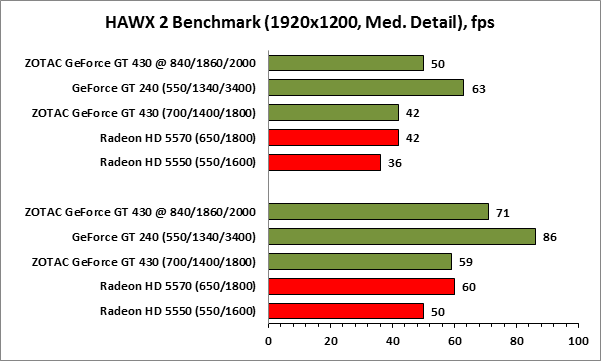 Свежий бенчмарк из игры HAWX 2 демонстрирует нам удивительное сходство результатов, полученных на разных ускорителях. Так Radeon HD 5570 идёт “ноздря в ноздрю” с GeForce GT 430 как в лёгких, так и в тяжёлых режимах.