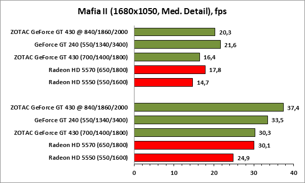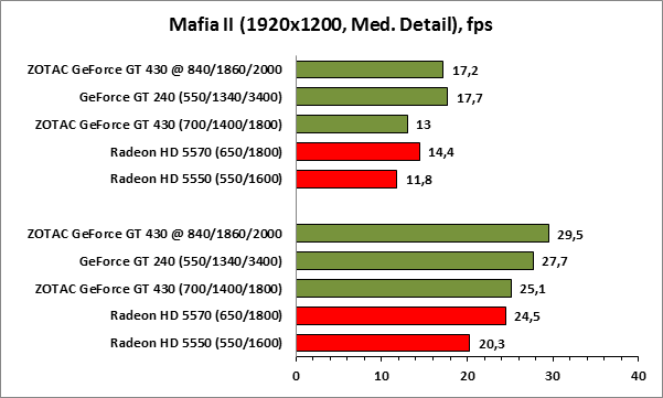 В Mafia II ускоритель ZOTAC GeForce GT 430, работающий на номинальных частотах, в лёгких режимах идёт на равных с Radeon HD 5570, а в тяжёлых немного уступает равноценному решению от AMD, сказывается сильное упрощение внутренней структуры GF108.