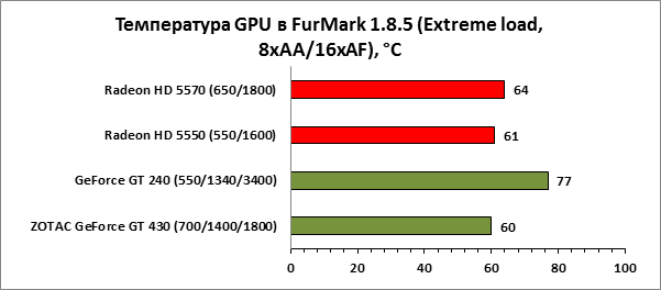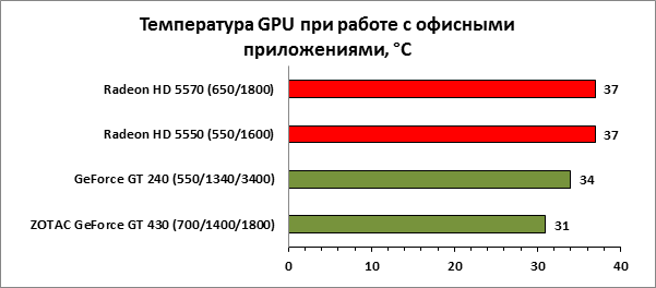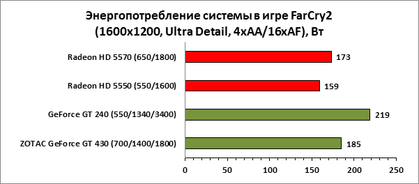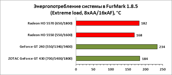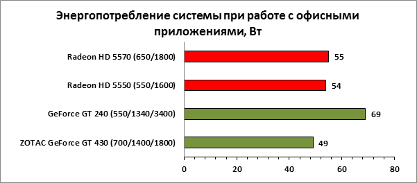 А вот с энергопотреблением дела обстоят несколько иначе. В офисном режиме система с ZOTAC GeForce GT 430 потребляет чуть меньше энергии, чем система с Radeon HD 5550, а вот после перехода в 3D-режим система с GT 430 от ZOTAC проявляет больший аппетит, чем эта же система с Radeon HD 5570.