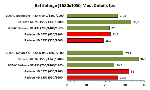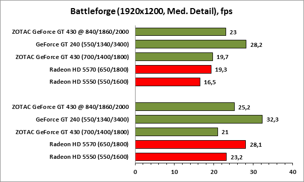 Синтетические тесты зачастую не способны точно отразить расстановку сил в играх. Так, обогнав Radeon HD 5570 по результатам тестирования в 3DMark Vantage, ускоритель GeForce GT 430 производства ZOTAC не смог повторить своего достижения в Battleforge. В этой игре новинка уступила обоим представителям красного лагеря в лёгких режимах и смогла сравняться с Radeon HD 5570 в тяжёлых.