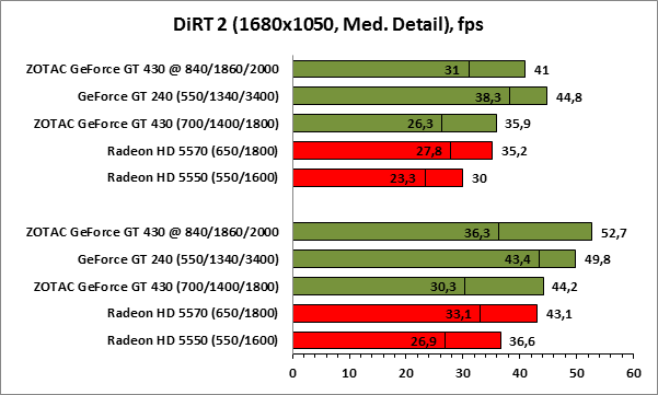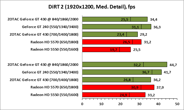 В DIRT 2 ускоритель GeForce GT 430 производства ZOTAC выглядит достаточно уверенно, однако Radeon HD 5570 в целом оказывается чуточку производительнее.