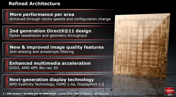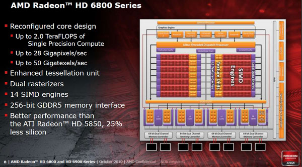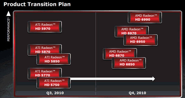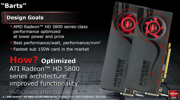 Официальные слайды AMD говорят о том, что новый Radeon HD 6870 по уровню производительности должен быть немного быстрее Radeon HD 5850, а Radeon HD 6850 займёт место между Radeon HD 5770 и Radeon HD 5850.