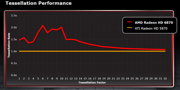 Пожалуй, одним из основных отличий нового графического процессора стал улучшенный блок тесселляции. По заявлению AMD, его производительность в случае с Radeon HD 6870 может быть до двух раз выше, чем у Radeon HD 5870, правда степень превосходства напрямую зависит от уровня тесселляции.