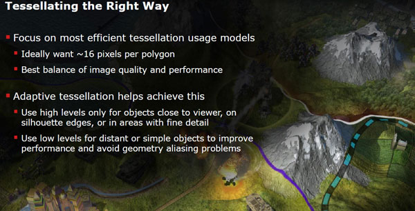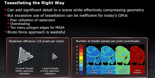 Безусловно, эту проблему не решить простым наращиванием “грубой мощи” графического процессора. Намного эффективнее использовать ряд оптимизаций. Для максимально эффективной работы блока растеризации современных GPU AMD требуется, чтобы на один треугольник приходилось примерно 16 пикселей. Кроме того, высокую степень тесселляции стоит использовать только в том случае, если: