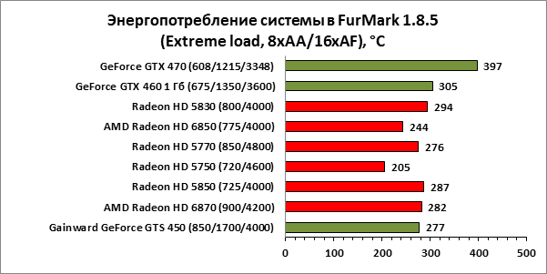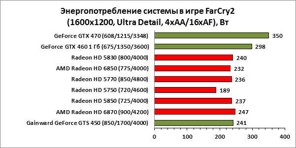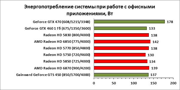 Технологии энергосбережения, реализованные в видеокартах AMD Radeon HD 5xxx и 6xxx, справляются с поставленной задачей вполне успешно. Все видеокарты семейства Radeon HD показывают близкие результаты, впрочем, GeForce GTS 450 и GeForce GTX 460 тоже не отстают. Единственный аутсайдер – GeForce GTX 470, который, будучи установлен на наш тестовый стенд, повлиял на энергопотребление системы не лучшим образом.