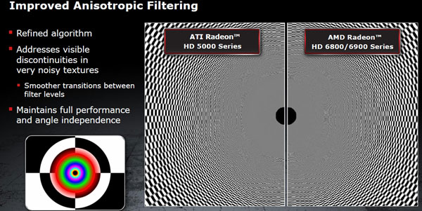 Не забыли в AMD и про улучшения качества анизотропной фильтрации. Новые ускорители Radeon HD 6850/6870 поддерживают усовершенствованные алгоритмы работы AF, качество реализации которых не зависит от угла обзора, при этом практически никак не сказывается на производительности.