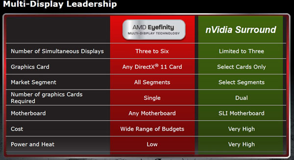 Более того, в этот раз в AMD решили напрямую сравнить Eyefinity с аналогичной технологией NVIDIA, которая, кстати, была анонсирована спустя некоторое время после Eyefinity. Часть из приведённых аргументов выглядит весьма убедительно, однако с некоторыми всё же можно поспорить.