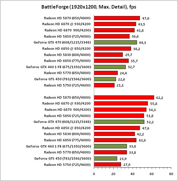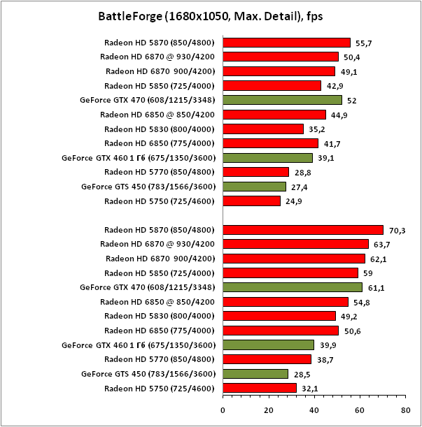 В Battleforge AMD Radeon HD 6850 удаётся без особого труда расправиться с основным конкурентом в лице GeForce GTX 460 во всех без исключения режимах. Интересно, что перед натиском HD 6850 не может устоять и Radeon HD 5830, проигрыш которого усиливается после включения режима полноэкранного сглаживания. Судя по всему, движок Battleforge отреагировал таким образом на большее количество блоков растеризации HD 6850. Тем временем Radeon HD 6870 оказывается быстрее Radeon HD 5850, особенно это видно в тяжёлых режимах со сглаживанием и фильтрацией, где серьёзный вклад в результат вносит показатель ПСП, а также более высокая частота GPU HD 6870. Что же касается противостояния с GTX 470, то здесь ситуация неоднозначная. C одной стороны, Radeon HD 6870 оказывается быстрее GTX 470 в режимах без использования MSAA/AF, с другой же, в тяжёлых режимах вперёд вырывается GeForce GTX 470.