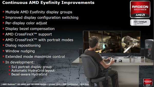 После выхода на рынок AMD Radeon HD 5870 прошло достаточно времени, прежде, чем мы смогли самостоятельно проверить в деле технологию Eyefinity. Уже на тот момент эта технология работала достаточно стабильно, а главное, чувствовался позитивный эффект в играх. Во время анонса Radeon HD 6850/6870 представители AMD не забыли упомянуть о ряде улучшений в работе Eyefinity, среди которых возможность создания нескольких Eyefinity групп, улучшенные алгоритмы переключения дисплеев, поддержка коррекции цвета на каждом отдельно взятом мониторе и т.д.