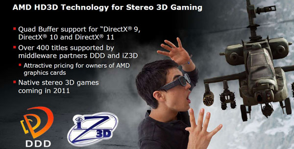 А вот по части внедрения технологий для просмотра 3D-контента AMD оказалась не первой. Уже довольно давно NVIDIA продвигает на рынок технологию 3DVision, поддержка которой реализована в сотнях игр. Однако, не быть первым, не значит стать худшим. И в AMD это прекрасно понимают. Поэтому, вместе с запуском ускорителей Radeon HD 6850/6870, производитель анонсировал технологию AMD HD3D, которая позволит владельцам новых видеокарт AMD насладиться 3D-стерео играми в полном объёме. В отличие от компании NVIDIA, которая самостоятельно продаёт очки для 3DVision, AMD даёт возможность сторонним производителям заниматься разработкой 3D-очков. Конечному потребителю от этого только польза, разумеется, если предлагаемые решения будут достаточно качественными.