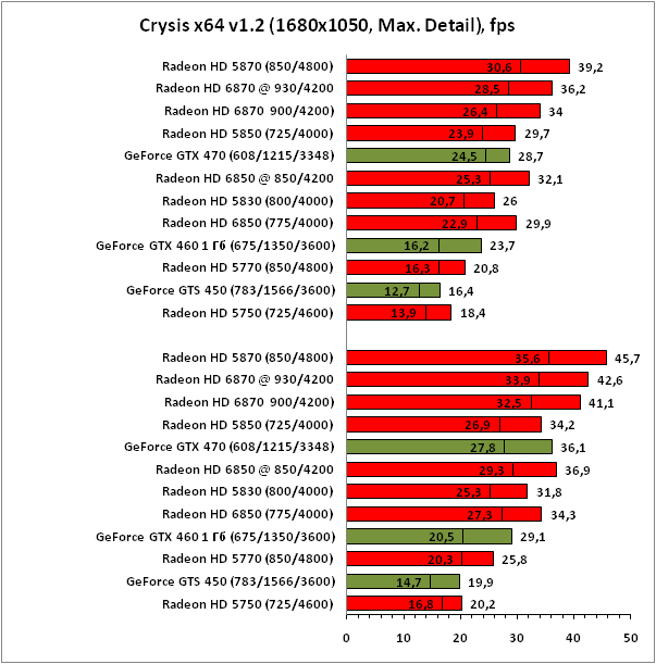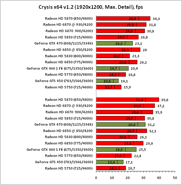 В Crysis обе новинки показывают себя с лучшей стороны. Ускоритель Radeon HD 6870 без труда обходит не только Radeon HD 5850, но и GeForce GTX 470, в свою очередь Radeon HD 6850, работающий на эталонных частотах, без особого труда справляется с GeForce GTX 460. Стоит отметить, что разгон Radeon HD 6850, впрочем, как и Radeon HD 6870 приносит своим плоды. В первом случае продукт AMD сумел не только приблизиться, но и обойти соперника в лице GeForce GTX 470, ну а в случае с HD 6870 удалось достичь результатов, близких к оным у Radeon HD 5870, хотя об абсолютном равенстве здесь речи не идёт.