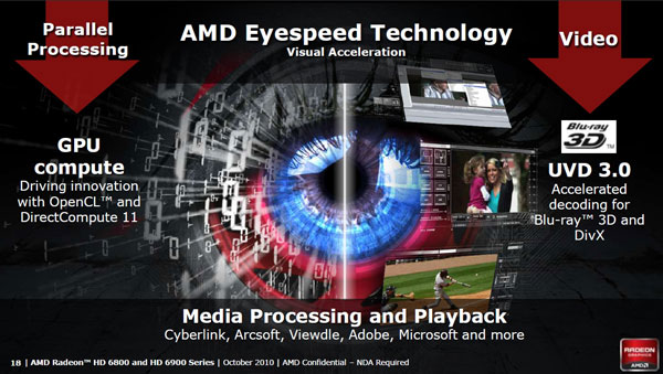 Наконец, нельзя не упомянуть о том, что AMD старается активно участвовать в продвижении параллельных вычислений силами графических процессоров, а также использовать внутренние ресурсов видеокарты для ускорения воспроизведения мультимедиа-контента, например, Blu-Ray 3D. В частности, в GPU Barts встроен видеопроцессор третьего поколения UVD3.