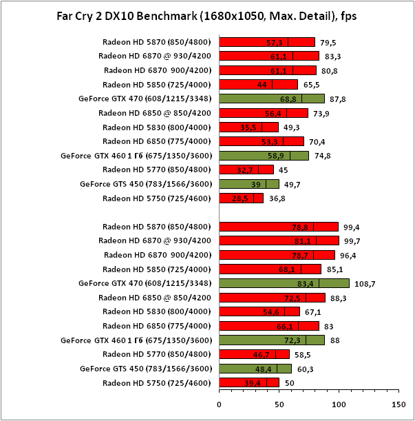 Аналогичная ситуация складывается и в случае с Radeon HD 6850. Да, в Far Cry 2 GeForce GTX 460 всё-таки немного быстрее, однако разница настолько мала, что вряд ли кто-то обратит на неё серьёзное внимание.