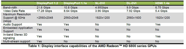Количество и тип разъёмов на панели выводов у Radeon HD 6850 и HD 6870 абсолютно одинаковы: 2x Mini DisplayProt, HDMI 1.4A, 2x DVI (DL-DVI + SL-DVI). Особо отметим тот факт, что AMD Radeon HD 6850/6870 поддерживают интерфейс DisplayPort версии 1.2, который отличается предыдущей версии данного интерфейса.