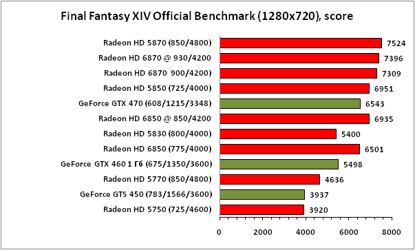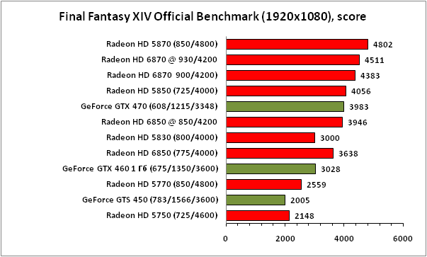 Результаты тестирования в Final Fantasy XIV Official Benchmark в особых комментариях не нуждаются. И Radeon HD 6850, и Radeon HD 6870 одержали уверенную победу в своей ценовой категории. Остаётся лишь отметить, что авторы этого теста предусмотрели свои оценки “играбильности” для разных диапазонов в баллах: