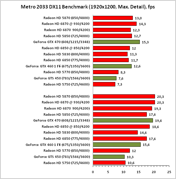 Несмотря на высокую номинальную тактовую частоту видеопамяти в 5000 МГц QDR, ни Radeon HD 6850, ни Radeon HD 6870 не смогли работать на частоте памяти выше 1050 (4200) МГц. Что касается роста частот GPU, то здесь ситуация немного лучше. Графический процессор Radeon HD 6850 смог стабильно работать на частоте 850 МГц, а видеочип Radeon HD 6870 осилил 930 МГц. Итоговые частотные формулы составили: