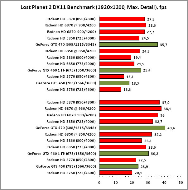 Lost Planet 2 – одна из самых новых игр с поддержкой DirectX 11. На максимальной детализации даже Hi-End ускорители порой показывают недостаточную для комфортной игры производительность. Особенно это касается самых тяжёлых режимов, с активированным полноэкранным сглаживанием и анизотропной фильтрацией. Как показали наши тесты, в эту игру лучше всего играть на ускорителях NVIDIA, разумеется, если в ближайшее время в драйверах AMD не появится ряд оптимизаций. Без AA//AF Radeon HD 6870 смог приблизиться к скоростным показателям GeForce GTX 470 только после разгона, и то, только в разрешении 1920x1200. Ну а в режимах со сглаживанием все представители зелёного лагеря чувствуют себя достаточно уверенно, обходя даже разогнанные продукты соперника.