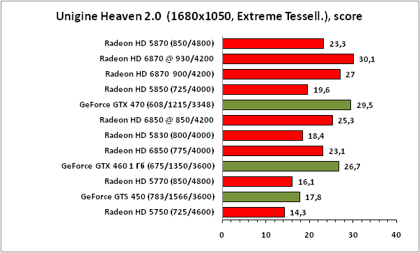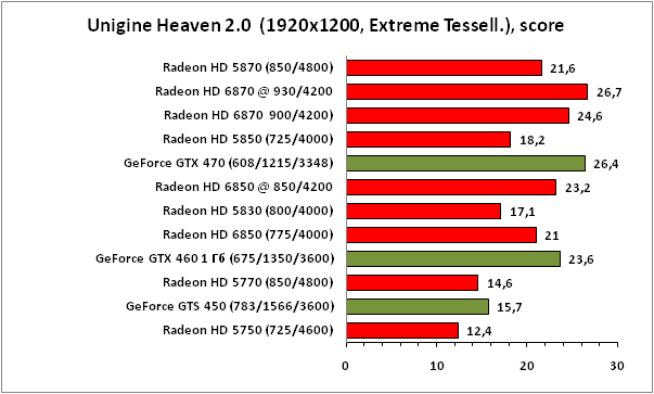 Расстановка сил такова: ускорители Radeon HD 6850 и HD6870 благодаря усовершенствованному блоку тесселляции в лёгких режимах смогли не только обойти Radeon HD 5830 и Radeon HD 5850, соответственно, но и потягаться с прямыми конкурентами из лагеря NVIDIA. Однако после включения полноэкранного сглаживания дела обстоят не так хорошо - в сверхтяжёлых режимах производительность продуктов AMD заметно падает, чем незамедлительно пользуются конкуренты.