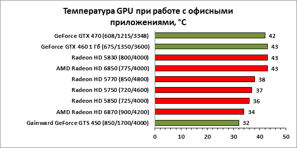В офисном режиме графический процессор Radeon HD 6870 оказался холоднее всех своих коллег, в то время как Radeon HD 6850 показал один из худших результатов, сопоставимых с показателями Radeon HD 5830.