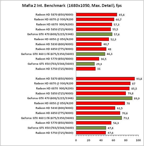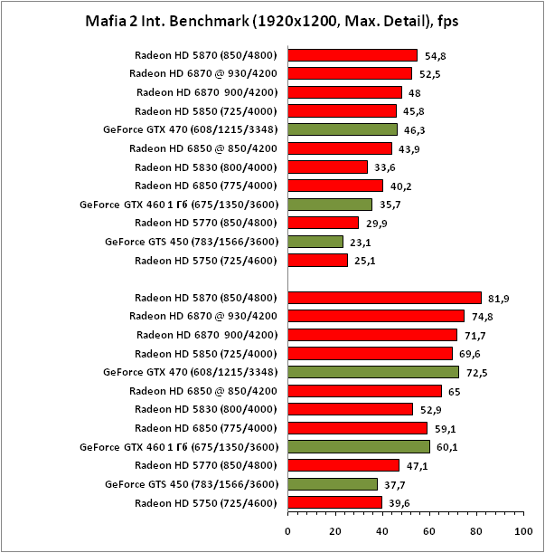 В целом, по результатам, полученным в Mafia 2, можно сказать, что новые ускорители Radeon HD 6850/6870 оказываются быстрее своих коллег – Radeon HD 5830/5850 и идут наравне с продуктами конкурентов, то обгоняя, то уступая им по величине среднего FPS.