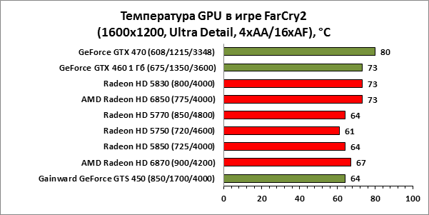 Максимальная нагрузка на видеокарту заставила графический процессор Radeon HD 6870 разогреться до 80 градусов Цельсия, в то время как GPU Radeon HD 5850, как и GPU GeForce GTX 460 оказались на 5 градусов горячее. Не подвёл и Radeon HD 6850, который хоть и не оказался также холоден как Radeon HD 5770, но всё же не догнал Radeon HD 5830, что в данном случае – несомненный плюс.