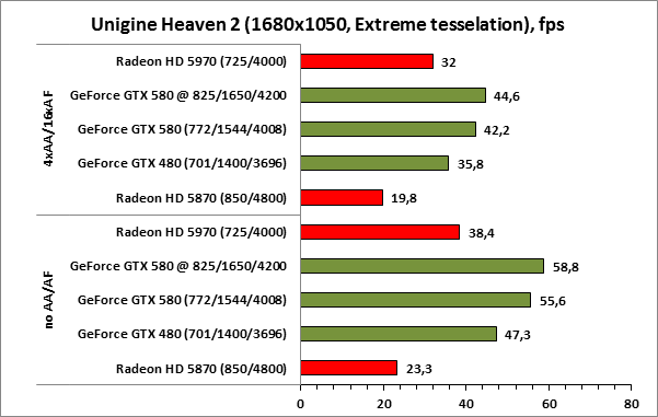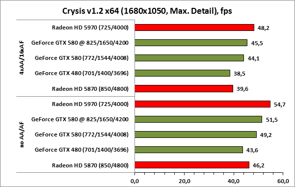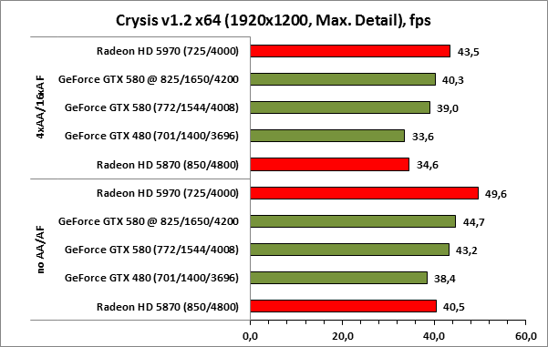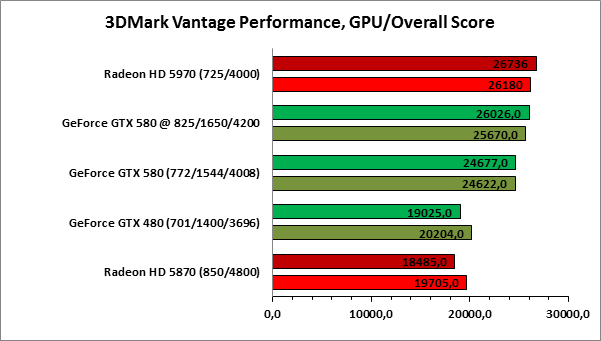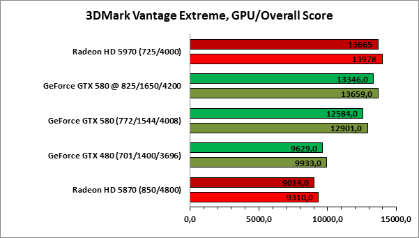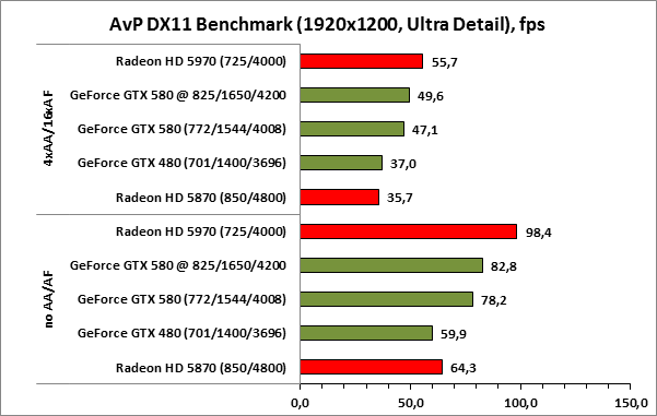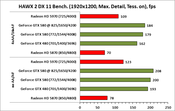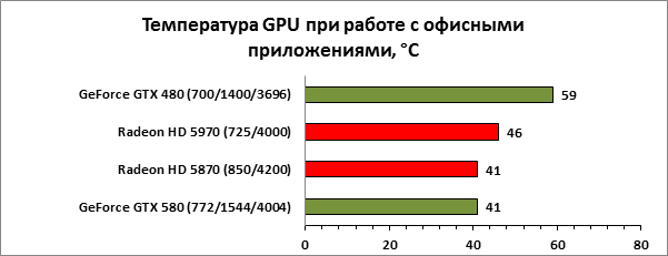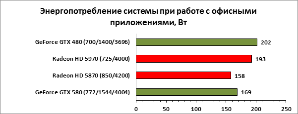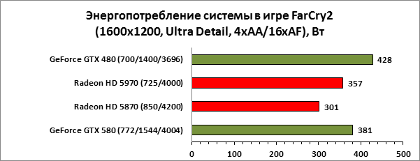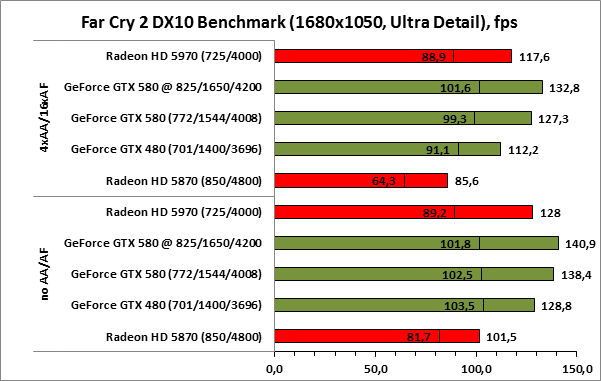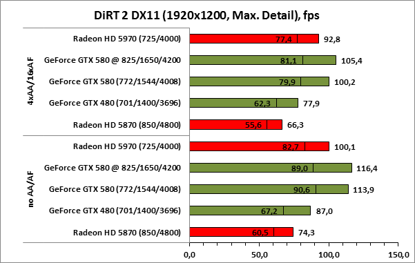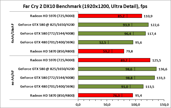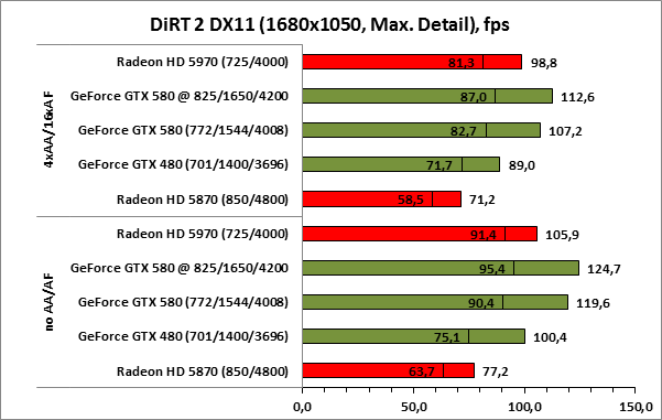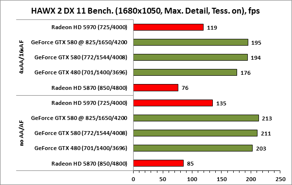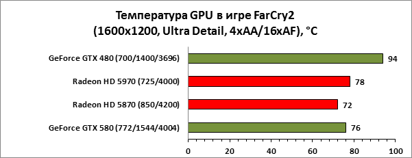 ⇡#РазгонОбычно для разгона видеокарт мы используем утилиту MSI Afterburner, не изменили традиции мы и на этот раз. Вторая версия Afterburner без проблем опознала ускоритель GeForce GTX 580 и позволила регулировать его тактовые частоты, а также снимать температурные показатели. В результате наших манипуляций с частотами GTX 580, удалось добиться стабильной работы ускорителя во всех тестах с частотной формулой 825/1650/4200 МГц для графического ядра, шейдерных блоков и видеопамяти, соответственно. ⇡#Замечания о работе ускорителя в режиме максимальной загрузки при помощи стресс-тестовКак мы писали выше, новые драйверы NVIDIA (262.99 и старше) определяют запуск утилит стресс тестирования (OCCT, FurMark 1.8) и занижают рабочие частоты ускорителя на 50%. При этом диагностическое ПО сторонних разработчиков пока не в состоянии корректно отследить такое снижение. В нашем случае, после запуска FurMark 1.8.5 были получены весьма сомнительные результаты, поэтому в этот раз мы решили не использовать стресс-тестирование для оценки температуры и энергопотребления, ограничившись лишь игровым режимом в Far Cry 2. ⇡#Температура и энергопотребление![]() ![]() Как правило, во всех наших тестах температура графических процессоров AMD оказывается ниже, чем температура GPU равноценных ускорителей NVIDIA, в случае, если установлена эталонная система охлаждения. В данном случае ситуация иная. В офисном режиме температура графического процессора GeForce GTX 580 находится на одном уровне с GPU Radeon HD 5870, в игровом режиме GF110 оказывается всего на 4 градуса горячее, что очень даже неплохо, поскольку менее производительный GF100 в аналогичных условиях прогревался до 94 градусов Цельсия! Для получения подобного результата, как мы уже говорили выше, инженеры NVIDIA не только использовали новую систему охлаждения, принцип работы которой идентичен принципу работы СО Radeon HD 5970, но и провели серьёзную “транзисторную” модернизацию GPU. Обратим ваше внимание, что на протяжении всего процесса тестирования шум системы охлаждения GeForce GTX 580 не выделялся на фоне шума остальных компонентов системы. С нашей точки зрения это очень хороший результат, особенно учитывая прошлые “заслуги” NVIDIA в плане нагрева GPU и уровня шума стандартных систем охлаждения. Посмотрим, как обстоят дела с аппетитом GTX 580. ![]() ![]() В типичных режимах с энергопотреблением у GeForce GTX 580 тоже наблюдается полный порядок. Да, Radeon HD 5870 по-прежнему экономичнее, однако разница между GTX 580 и HD 5870 настолько незначительна, что в данном случае можно засчитать ничью. ![]() ![]() ![]() В отличие от GeForce GTX 480, который хоть и опережает Radeon HD 5870, но делает это не очень уверенно, ускоритель GeForce GTX 580 отрывается от конкурента достаточно заметно. Более того, даже без разгона GeForce GTX 580 находится в опасной близости от флагмана компании AMD – ускорителя Radeon HD 5970. ![]() ![]() Как мы уже неоднократно отмечали, архитектура GF100 (а значит и GF110) оптимизирована для работы в сверхтяжёлых режимах. В режимах без сглаживания с существенным отрывом от всех прочих ускорителей идёт Radeon HD 5970, но как только включается полноэкранное сглаживание, двухчиповый флагман AMD начинает сдавать позиции, не сильно опережая неразогнанный ускоритель GeForce GTX 580 в разрешении 1680x1050 и отставая от него при работе с разрешением 1920x1200. ![]() ![]() Как известно, гоночный симулятор Colin McRae DiRT 2 стал одной из первых игр, поддерживающих DirectX 11 и тесселляцию, испол
