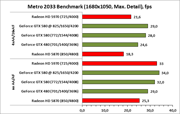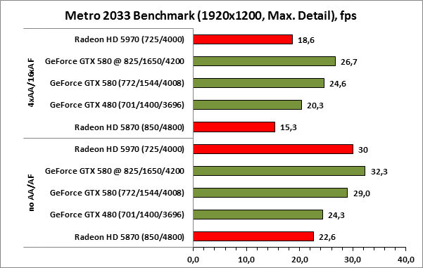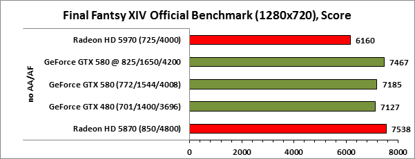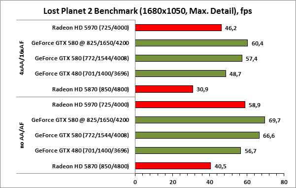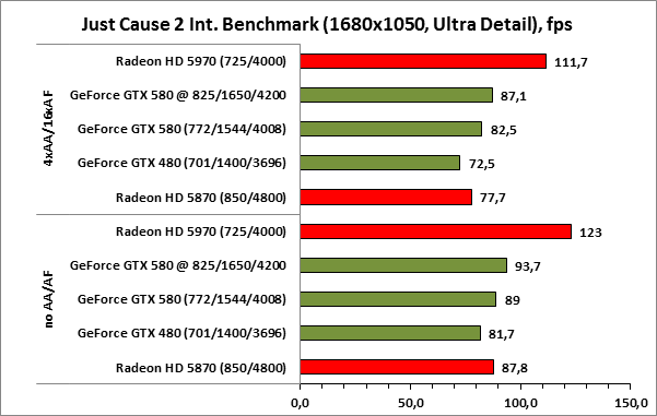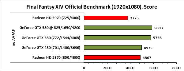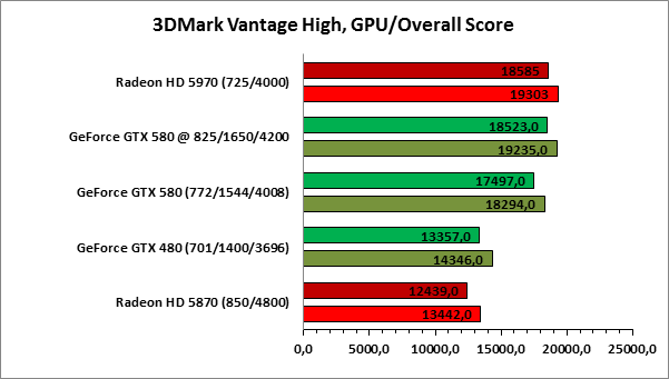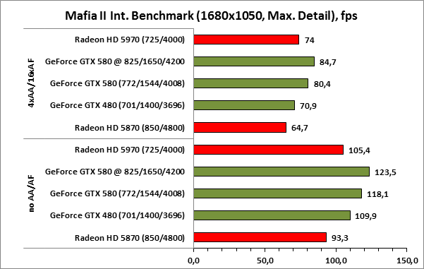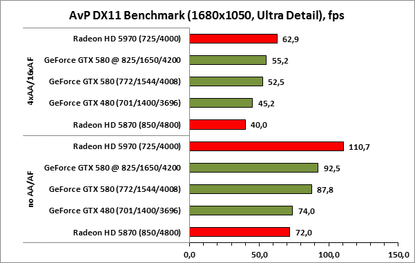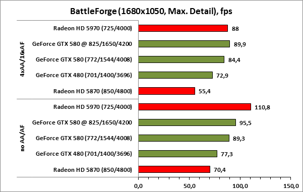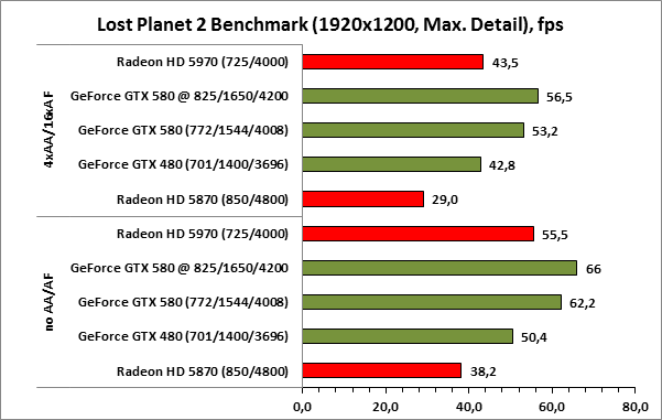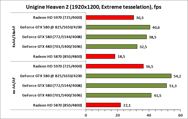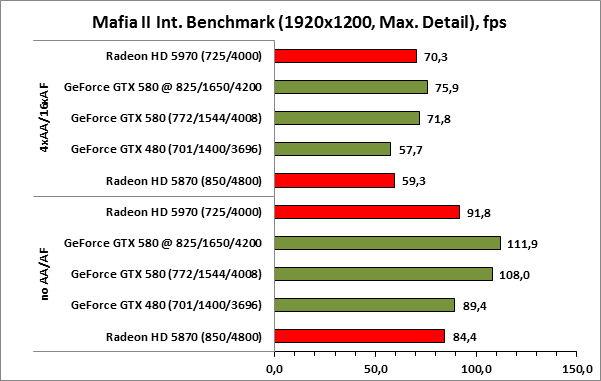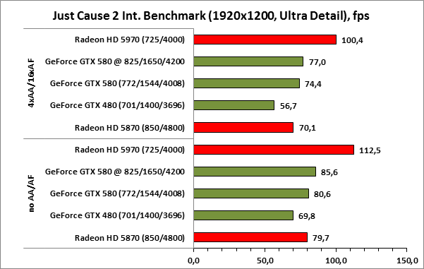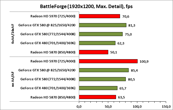⇡#РазгонОбычно для разгона видеокарт мы используем утилиту MSI Afterburner, не изменили традиции мы и на этот раз. Вторая версия Afterburner без проблем опознала ускоритель GeForce GTX 580 и позволила регулировать его тактовые частоты, а также снимать температурные показатели. В результате наших манипуляций с частотами GTX 580, удалось добиться стабильной работы ускорителя во всех тестах с частотной формулой 825/1650/4200 МГц для графического ядра, шейдерных блоков и видеопамяти, соответственно. ⇡#Замечания о работе ускорителя в режиме максимальной загрузки при помощи стресс-тестовКак мы писали выше, новые драйверы NVIDIA (262.99 и старше) определяют запуск утилит стресс тестирования (OCCT, FurMark 1.8) и занижают рабочие частоты ускорителя на 50%. При этом диагностическое ПО сторонних разработчиков пока не в состоянии корректно отследить такое снижение. В нашем случае, после запуска FurMark 1.8.5 были получены весьма сомнительные результаты, поэтому в этот раз мы решили не использовать стресс-тестирование для оценки температуры и энергопотребления, ограничившись лишь игровым режимом в Far Cry 2. ⇡#Температура и энергопотребление![]() ![]() Как правило, во всех наших тестах температура графических процессоров AMD оказывается ниже, чем температура GPU равноценных ускорителей NVIDIA, в случае, если установлена эталонная система охлаждения. В данном случае ситуация иная. В офисном режиме температура графического процессора GeForce GTX 580 находится на одном уровне с GPU Radeon HD 5870, в игровом режиме GF110 оказывается всего на 4 градуса горячее, что очень даже неплохо, поскольку менее производительный GF100 в аналогичных условиях прогревался до 94 градусов Цельсия! Для получения подобного результата, как мы уже говорили выше, инженеры NVIDIA не только использовали новую систему охлаждения, принцип работы которой идентичен принципу работы СО Radeon HD 5970, но и провели серьёзную “транзисторную” модернизацию GPU. Обратим ваше внимание, что на протяжении всего процесса тестирования шум системы охлаждения GeForce GTX 580 не выделялся на фоне шума остальных компонентов системы. С нашей точки зрения это очень хороший результат, особенно учитывая прошлые “заслуги” NVIDIA в плане нагрева GPU и уровня шума стандартных систем охлаждения. Посмотрим, как обстоят дела с аппетитом GTX 580. ![]() ![]() В типичных режимах с энергопотреблением у GeForce GTX 580 тоже наблюдается полный порядок. Да, Radeon HD 5870 по-прежнему экономичнее, однако разница между GTX 580 и HD 5870 настолько незначительна, что в данном случае можно засчитать ничью. ![]() ![]() ![]() В отличие от GeForce GTX 480, который хоть и опережает Radeon HD 5870, но делает это не очень уверенно, ускоритель GeForce GTX 580 отрывается от конкурента достаточно заметно. Более того, даже без разгона GeForce GTX 580 находится в опасной близости от флагмана компании AMD – ускорителя Radeon HD 5970. ![]() ![]() Как мы уже неоднократно отмечали, архитектура GF100 (а значит и GF110) оптимизирована для работы в сверхтяжёлых режимах. В режимах без сглаживания с существенным отрывом от всех прочих ускорителей идёт Radeon HD 5970, но как только включается полноэкранное сглаживание, двухчиповый флагман AMD начинает сдавать позиции, не сильно опережая неразогнанный ускоритель GeForce GTX 580 в разрешении 1680x1050 и отставая от него при работе с разрешением 1920x1200. ![]() ![]() Как известно, гоночный симулятор Colin McRae DiRT 2 стал одной из первых игр, поддерживающих DirectX 11 и тесселляцию, испол