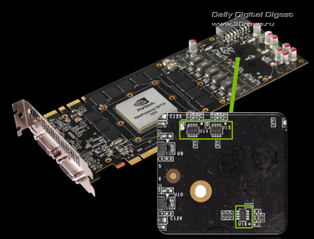 Ну что же, поставленные цели, как нам кажется, отражают пожелания поклонников Hi-End продукции NVIDIA, остаётся на практике проверить, что же получилось, но прежде чем мы перейдём к практическим испытаниям GeForce GTX 580, давайте немного поговорим о технологиях, поддерживаемых современными GPU NVIDIA. В сравнении с GeForce GTX 480 и другими представителями архитектуры Fermi, новый GeForce GTX 580 не получил поддержку каких-либо новых технологий. Как и большинство других современных ускорителей NVIDIA, GeForce GTX 580 полностью поддерживает технологии NVIDIA PhysX и CUDA, которые позволяют использовать ресурсы графического процессора для разного рода параллельных вычислений, например, аппаратное ускорение PhysX используется для включения ряда физических спецэффектов в играх, основанных на движке PhysX. К сожалению, на данный момент игр с поддержкой технологии NVIDIA PhysX не так много, хотя среди них есть и весьма выдающиеся проекты, например, Batman Arkham Asylum, Mafia II и Metro 2033. Никуда не делась и поддержка NVIDIA 3DVision, особенностям работы которой мы посвятили отдельный материал. Нельзя также не упомянуть технологии NVIDIA Surround и NVIDIA 3DVision Surround. По сути, NVIDIA Surround представляет собой несколько ограниченный аналог технологии Eyefinity, которую компания AMD анонсировала ещё осенью 2009 года. Суть NVIDIA Surround заключается в том, что подключив к компьютеру три монитора, пользователь может объединить их в единое рабочее пространство, рассматриваемое системой как один большой монитор. Ограничения NVIDIA Surround связаны с невозможностью объединения в единое пространство более трёх мониторов, а также с необходимостью использования как минимум пары видеокарт NVIDIA в режиме SLI для активации технологии NVIDIA Surround. Что же касается NVIDIA 3DVision Surround, то эта технология позволяет получить дополнительный эффект присутствия в виртуальных мирах благодаря совместному использованию 3D-очков NVIDIA и трёх 120 Гц-мониторов. К сожалению, на данный момент мы не сможем поделиться своими впечатлениями от работы с NVIDIA Surround/3DVison Surround, однако в будущем, если у нас будет такая возможность, мы обязательно это сделаем. Ну, а теперь, пришла пора познакомиться с GeForce GTX 580, встречайте: В нашей тестовой лаборатории оказался эталонный образец ускорителя GeForce GTX 580. Несмотря на то, что новая СО GTX 580 заметно отличается от кулера эталонной версии GTX 480, в дизайне системы охлаждения новинки просматриваются характерные черты, свойственные многим Hi-End продуктам NVIDIA. Тут можно провести аналогию с автопромом, например, машины марки BMW имеют ряд характерных особенностей, которые делают эти авто узнаваемыми даже при существенном изменении дизайна кузова. На панели выводов GeForce GTX 580, помимо вентиляционных отверстий, присутствуют три цифровых разъёма: два DL-DVI и один Mini-HDMI. Демонтируем систему охлаждения GeForce GTX 580. Как вы, наверное, уже успели заметить, новая система охлаждения GTX 580 лишена тепловых трубок, которые присутствовали в СО GeForce GTX 480. На сей раз система охлаждения топового ускорителя NVIDIA основана на испарительной камере. Графический процессор контактирует с площадкой, прямо над которой располагается герметичный отсек - в нем находится жидкость с низкой температурой кипения. При повышении температуры жидкость меняет своё агрегатное состояние и превращается в газ, перенося с собой тепло к верхней части системы охлаждения. Слегка остывая, газ конденсируется и вновь превра