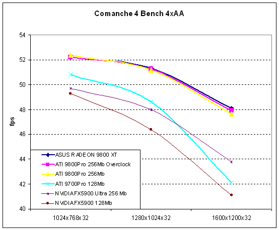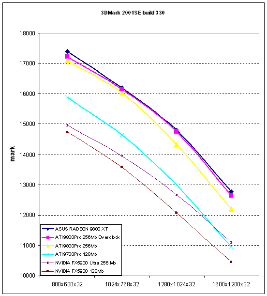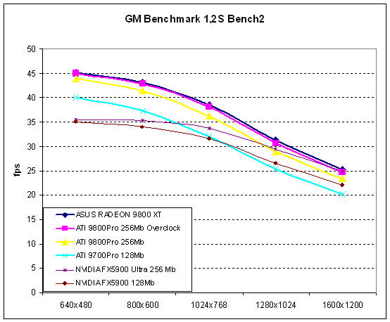 Мы попытались эмулировать работу RADEON 9800 XT, разогнав 9800Pro до частот 9800XT. На графиках эта карта называется "ATI 9800Pro 256Mb Overclock". Разница в результатах как раз и позволит оценить выигрыш от использования системы динамического разгона, впервые реализованной в продукте ATI и улучшенной подсистемы памяти.