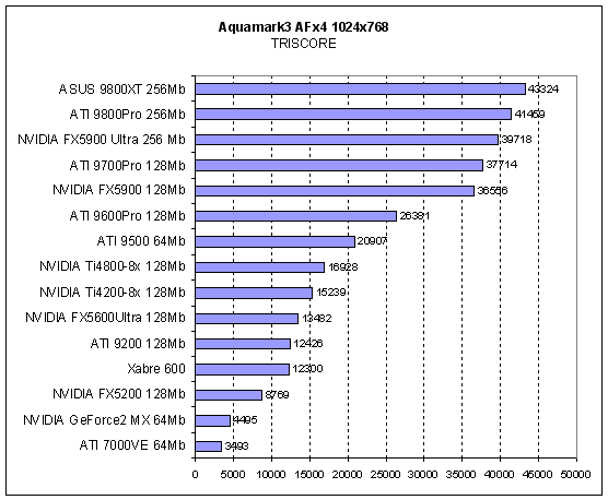 Результаты выводятся в неких "попугаях" под названием Triscore, но если поделить их на 1000, то как раз и получится среднее значение FPS на данной карте. Т.е. 9800XT вывела в среднем 43 кадра в секунду, а GF2MX - 4 с половиной кадра.
