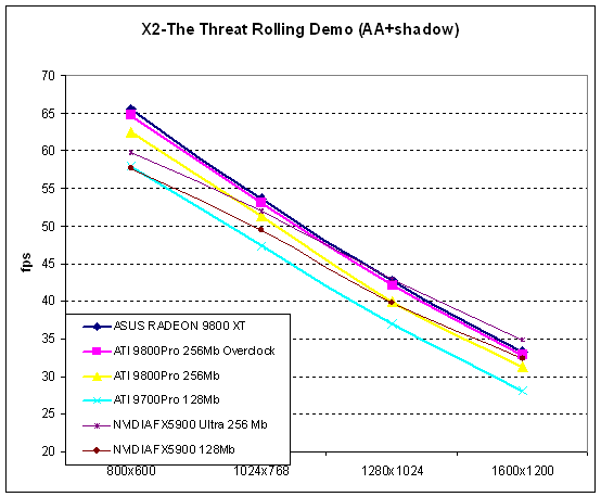 При включении теней и антиальязинга картина не столь драматична и даже есть выигрыш FX5900Ultra в разрешении 1600x1200. Правда, играбельным подобное разрешение назвать весьма трудно.