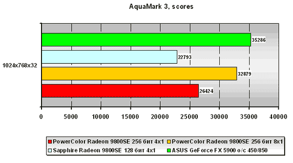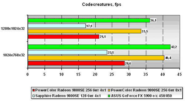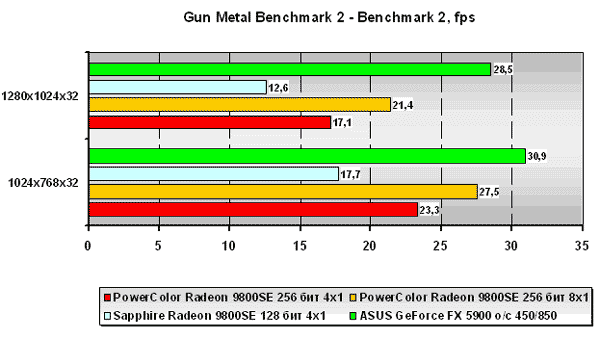 В весьма тяжёлом графическом тесте, использующим пиксельные шейдеры 1.1 и вершинные версии 2.0 урезанность Sapphire Radeon 9800SE 128 бит даёт о себе знать в очень серьёзном процентом соотношении с платой PowerColor ATI Radeon 9800SE 256 бит. Переделка PowerColor ATI Radeon 9800SE 256 бит даёт плате PowerColor серьёзные дивиденды.