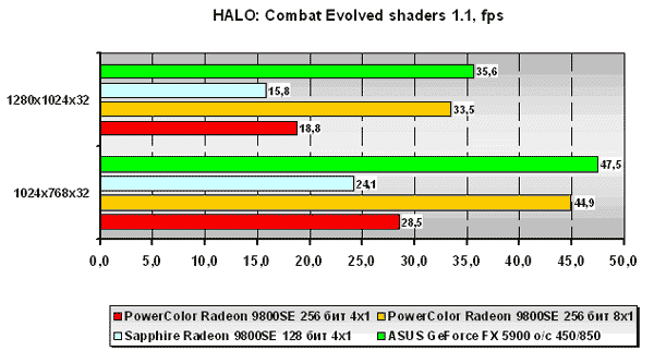 С выходом новых драйверов ForceWare 52.16 расклад сил в данном реальном игровом DirectX 9.0 тесте изменился в лучшую для NVIDIA сторону. Как видим, на обоих бенчмарках ASUS V9950 @ 450/850 уверенно лидирует. Также просим вас обратить внимание на просто невиданный до селе эффект от включения 4-х дополнительных конвейеров рендеринга.