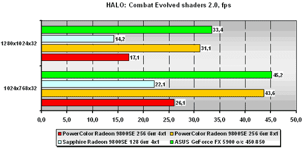 Тесты на плате PowerColor Radeon 9800SE проводились в двух режимах. В номинальном и с разблокированными 4-мя дополнительными (точнее законными ATI Radeon 9800 Pro) конвейерами. Несколько плат от Sapphire на PCB от ATI Radeon 9500 Pro переделке поддались, но тесты пройти не смогли. То есть перед нами типичный пример того, что "не все платы ATI Radeon 9800SE одинаково полезны =)". Также для сравнения приведены результаты разогнанной платы на NVIDIA GeForce FX 5900 до частот Ultra версии чипа, чтобы можно было наглядно соотносить результаты пропатченного PowerColor Radeon 9800SE с конкурентом из стана NVIDIA. Тем более, что ни в первом, ни во втором случае мы не получим плат, работающих настолько же быстро, как и оригинальные ATI Radeon 9800 Pro и NVIDIA GeForce FX 5900. Тем и интересно сравнение в том плане, что Hi-End платы если и покупаются, то только с прицелом на дальнейшую их доработку и переделку, поэтому пользователям, думаю, будет интересно сравнить результаты плат от обоих флагманов 3D-графики на сегодняшний день, каким-либо образом поддавшиеся переделке/разгону.