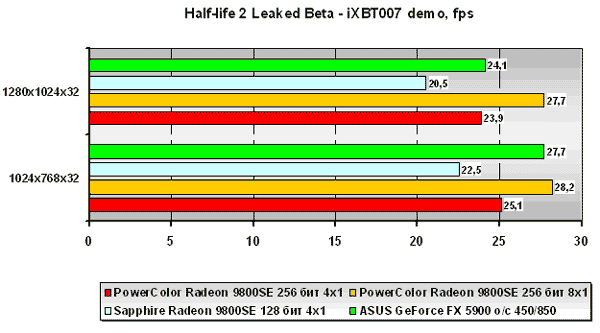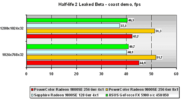 С Half-Life 2 ситуация для NVIDIA весьма неоднозначная. С одной стороны – явный проигрыш в одном из тестов (результаты на уровне Radeon 9800SE 128 бит!).С другой, уже более хорошая картина в другом из банчмарков. Однако, полученный нами, ATI Radeon 9800 Pro всё равно лидирует в общем зачёте и в первом и во втором тестах.