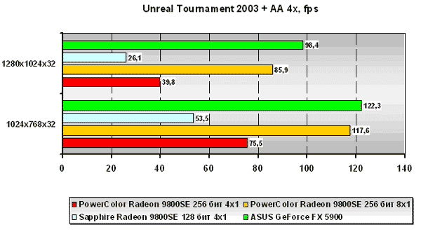 Unreal Tournament 2003, традиционно "любящий" карты NVIDIA показывает здесь явное преимущество нашего с вами представителя калифорнийской компании в данном тесте. В остальном же: всё те же печальные результаты ATI Radeon 9800SE 128 бит и всё те же выдающееся результаты ATI Radeon 9800SE со всеми включёнными конвейерами рендеринга.