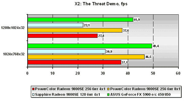 Лидерство сходных по позиционированию продуктов NVIDIA в данном тесте уже традиционно. Обработка стенсильных теней на картах NVIDIA в движке X2: The Threat требует меньшего количества проходов. Раскладка сил в стане 2-х вариантов ATI Radeon 9800SE та же.