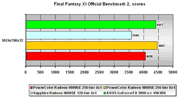 Как можно видеть из диаграмм разница в производительности между оригинальным ATI Radeon 9800SE 256 бит и его "пропатченным вариантом" весьма и весьма существенна (в предыдущем тесте такой яркой разницы нельзя было увидеть из-за большей процессорозависимости данного теста в сравнении с 3DMark 2003). А ведь за 128 и 256 бит версии ATI Radeon 9800SE порой хотят одинаковые деньги, и нужно отметить очень даже немалые.