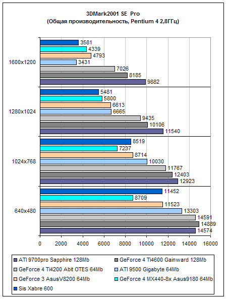 Как всегда, нижнее разрешение практически у всех карт идентично (хоть это радует), сразу становятся видны аутсайдеры - это GeForceMX 400 и SiS Xabre 600. В этом тесте испытуемая карта держится на одном уровне с GeForce 3, слегка обгоняя его в 800х600 и немного проигрывая в 1600х1200. Хочется отметить, что падение производительности по сравнению с флагманской картой 9700Pro весьма значительное и в высоких разрешениях это соотношение переваливает больше чем в два раза.