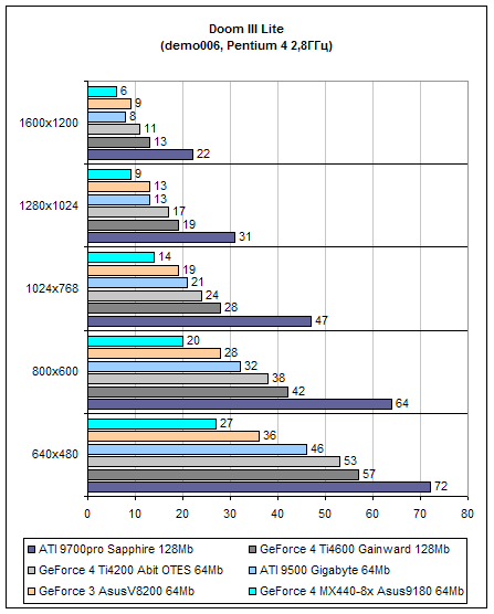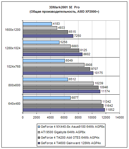 положительно на производительности. Откровенно говоря, хотя это и ожидалось изначально, но такое падение производительности все равно слегка шокирует. В нижних разрешениях, производительность держится в середине меж GeForce 4 Ti4200 и GeForce 3, что в общем то неплохо. Никакой зависимости от процессора не наблюдается, так как график выглядит абсолютно линейно. Но, начиная с разрешения