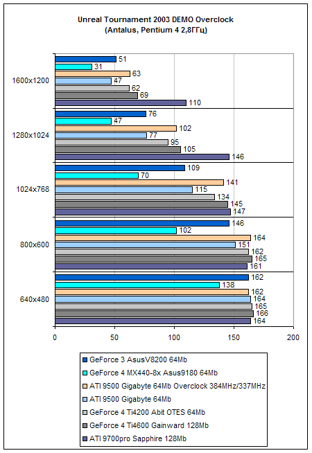 В этом тесте, как и во многих других, скорость работы ATI R9500 на одном уровне с GeForce 3 и значительно ниже старшей карты на