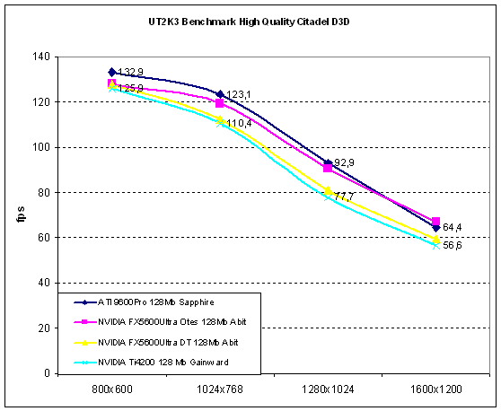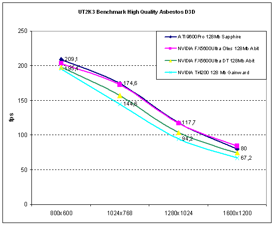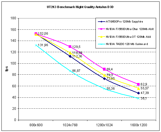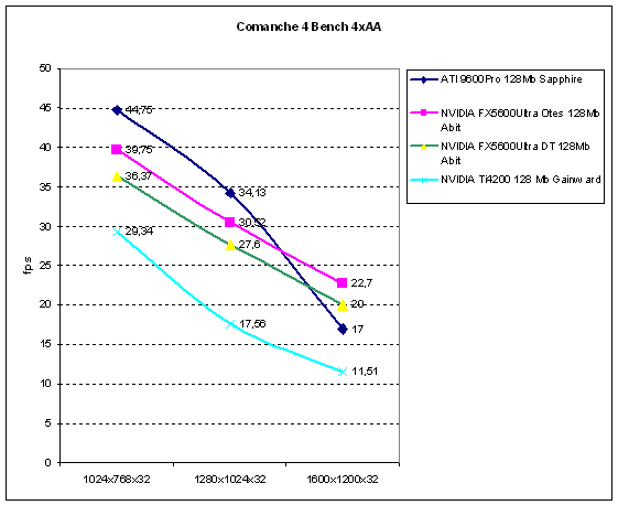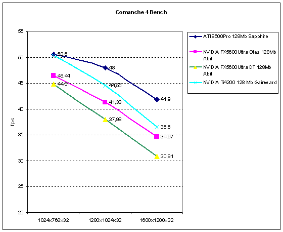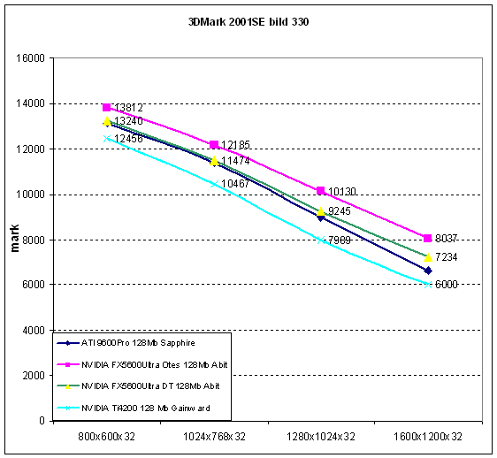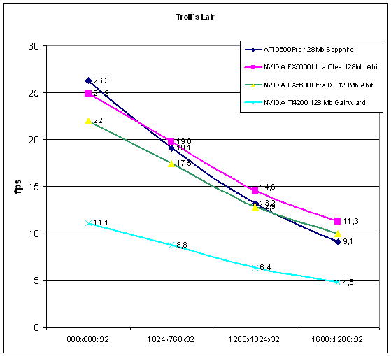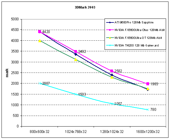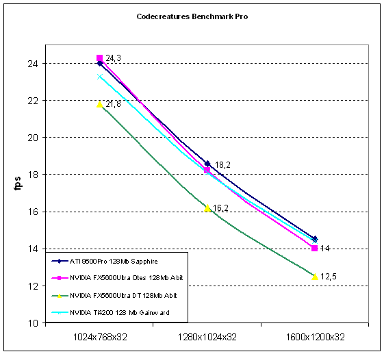 Для сравнения нынешнего "среднего диапазона" мы взяли карту Gainward Ti4200 128Mb, можно, конечно, добавить в графики и результаты еще десяток карт, но это серьезно замусоривает восприятие данных. Так что ограничимся четырьмя картами, а в особых случаях добавим результаты других соперников.