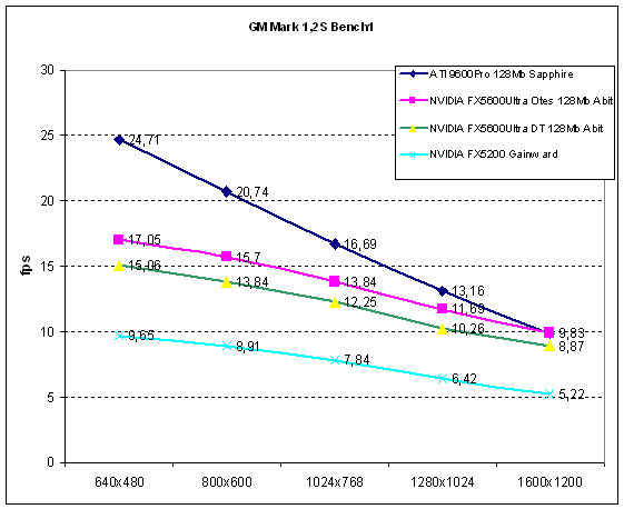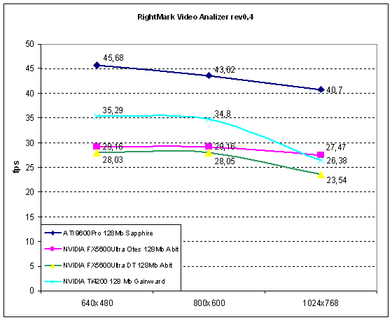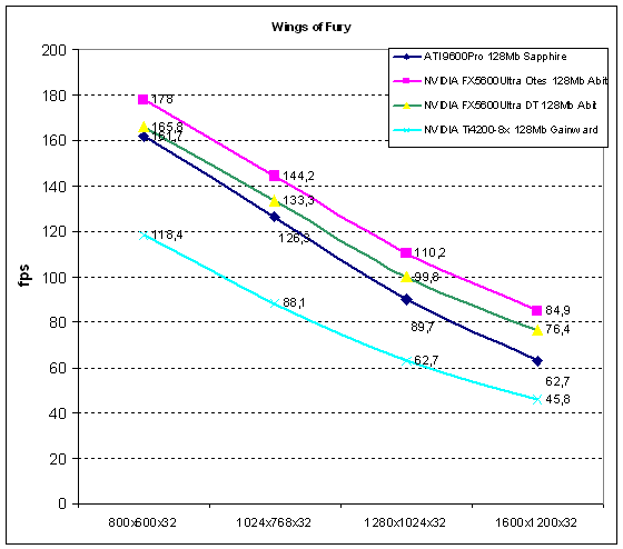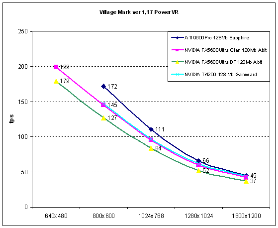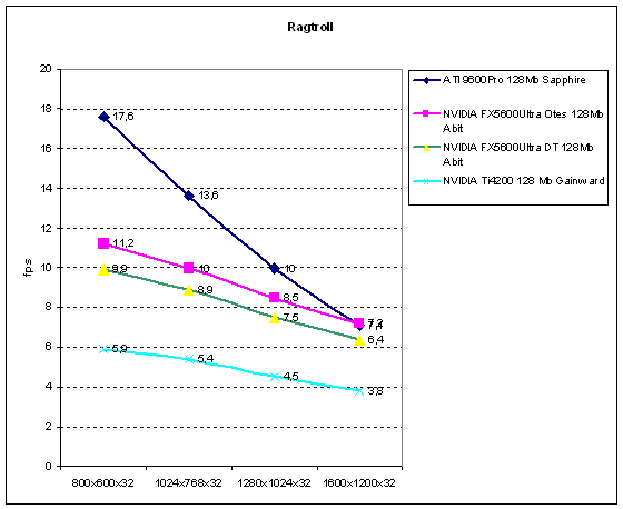 Тест старенький и имеет оригинальную "фичу"... Видимо, создателям даже в голову не могло прийти, что наступят те времена, когда fps зашкалит за отметку 200. Т.е. 200FPS - это потолок, выше которого результаты на экран не выводятся и ставится циферка "0". Ti4200 не смог выдать результат на разрешении 640x480 - его значение зашкалило за 200FPS, а вот FX5600Ultra new core - справился ;-)))